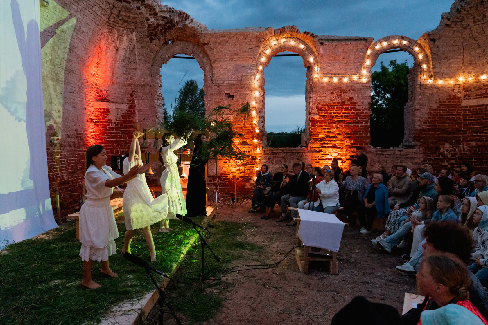 Центральным событием первого дня фестиваля стала иммерсивная постановка, режиссером которой была сама Юлия Герцева. Действо развернулось прямо под открытым небом руин, где декорациями стали закатное, а потом звездное небо, деревенские улицы и снопы скошенного сена. Это был не классический концерт, а глубокое погружение в прошлое — отчасти разрушенное и забытое, но столь важное для понимания самих себя. Даже дорога до места проведения стала частью этого незабываемого оживлении истории.